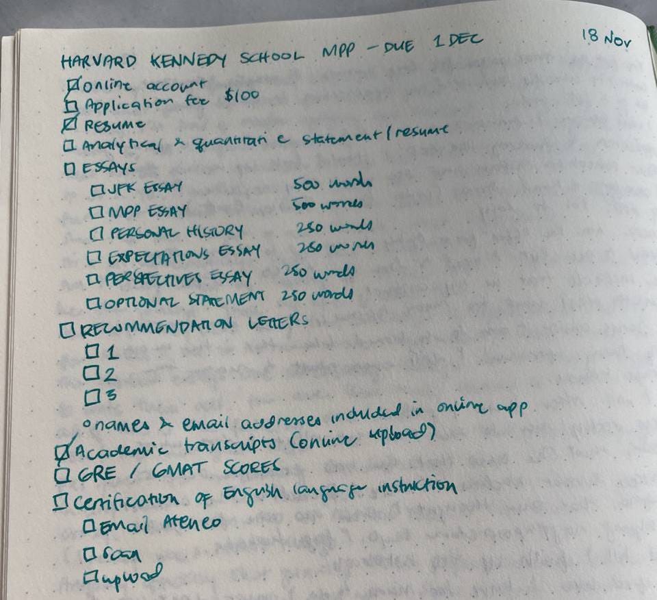 Preparing to apply for school was its own fraught journey, and it only got more intense when I approached a former boss and mentor to ask for a recommendation letter. I tried (and failed) to treat YO to lunch as thanks for taking the time out of her schedule to write a recommendation letter for me, and she was adamant that I apply for Harvard. I remember choking on my coffee. Harvard? Harvard???