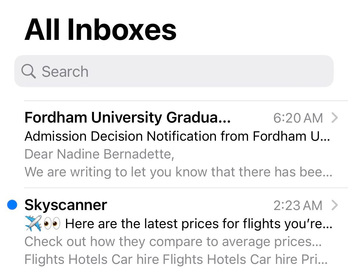 I woke up at 7AM on Saturday, March 10, to an email from Fordham. My hands were shaking as I held my phone, and I took a few minutes to brush my teeth and give myself a pep talk: Not the end of the world, you're not going to die, there are two more schools, and even after that there are more to apply to…